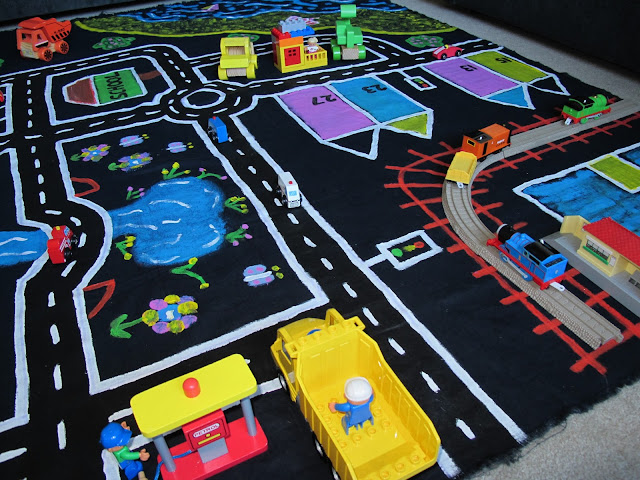 Here's what we did last week. The kids wanted a play mat. And they aren't cheap. So we (mostly me, but that's okay) made our own!
